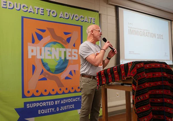 Educate to Advocate Symposium (April 12, 2025) A symposium on immigration initiated by the student leaders of Puentes, focusing on U.S. immigration education and community justice. The event featured speakers from key organizations and institutions serving immigrant communities, including Exodus Refugee, Neighborhood Christian Legal Clinic, Bethany Christian Services and others. Angelin Fisher, Legal Counsel and Director of Immigrant Services for the Neighborhood Christian Legal Clinic, presented Immigration 101 , offering participants firsthand knowledge of immigration laws and processes - and of the rights of those seeking citizenship. In addition to educational activity, students raised funds for La Plaza, Indianapolis' largest organization providing wraparound services to the Latino community, and other advocacy organizations through selling T-shirts, merchandise, and pulseras (handmade bracelets from Latin America).